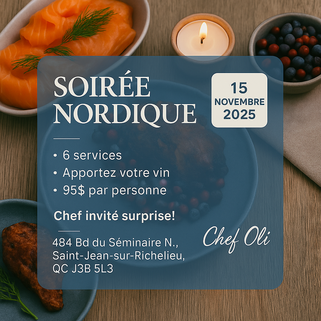Un menu inspiré du Grand Nord : fraîcheur, raffinement et découvertes culinaires au rendez-vous. Une soirée unique où Chef Oli partagera la scène avec un chef invité spécial.